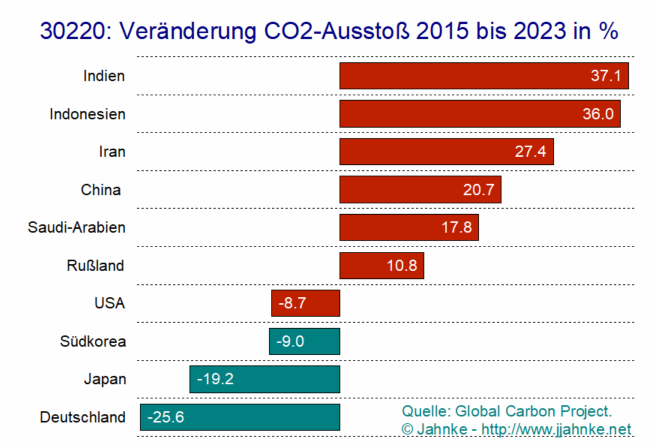 Der Ausstoß an klimaschädlichem CO2 hat sich seit 2015 sehr unterschiedlich entwickelt. Spitzenreiter beim Zuwachs ist Indien mit 37,1 %. Den größten Rückgang zwischen den größeren Industrieländern verzeichnet Deutschland mit minus 25,6 % (Abb. 30220).