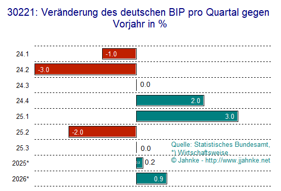 Die deutsche Wirtschaft schwächelt weiter. Das Expertengremium der Wirtschaftsweisen rechnet nun mit einem Wachstum des Bruttoinlandsprodukts von 0,9 Prozent (Abb. 30221). Auch im kommenden Jahr erwarten die Wirtschaftsweisen keinen breit angelegten Aufschwung in Deutschland. Der Sachverständigenrat korrigierte seine Erwartungen für 2026 leicht nach unten und rechnet nun mit einem Wachstum des Bruttoinlandsprodukts von 0,9 Prozent.