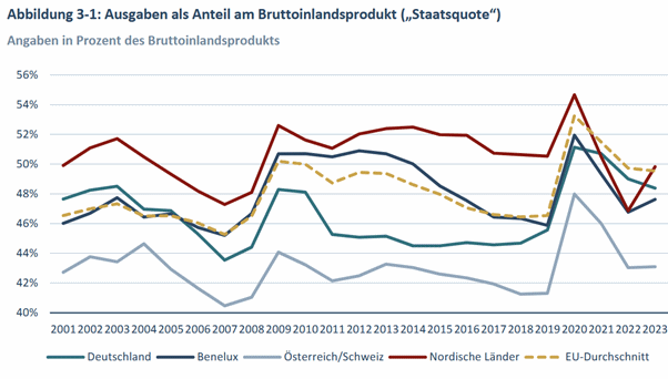 Den höchsten Wert wies in den meisten Jahren die nordische Ländergruppe auf, wo die Staatsquote in der Corona-Pandemie gar auf 55 Prozent anstieg. Nur in den Jahren 2021 und 2022 lagen die Werte unterhalb des EU-Durchschnitts. Die nordischen Länder sind die einzige Ländergruppe, deren Staatsquote im Jahr 2023 unterhalb des Vor-Corona-Niveaus lag. Zum Vergleich: in Deutschland lag der Wert zuletzt 2,8 Prozentpunkte über dem Vor-Corona-Niveau. Während die Benelux-Staaten weitgehend dem EU-Durchschnitt folgen, liegen die Werte in der Ländergruppe Österreich/Schweiz deutlich niedriger. Sie befinden sich im gesamten Be- obachtungszeitraum etwa 5 Prozentpunkte unter dem EU-Durchschnitt, am aktuellen Rand liegt der Wert bei 43 Prozent. Der EU-Durchschnitt lag zuletzt höher als die Werte in den meisten Vergleichsgruppen. Dies ist den hohen Staatsquoten etwa in Frankreich und Italien geschuldet.