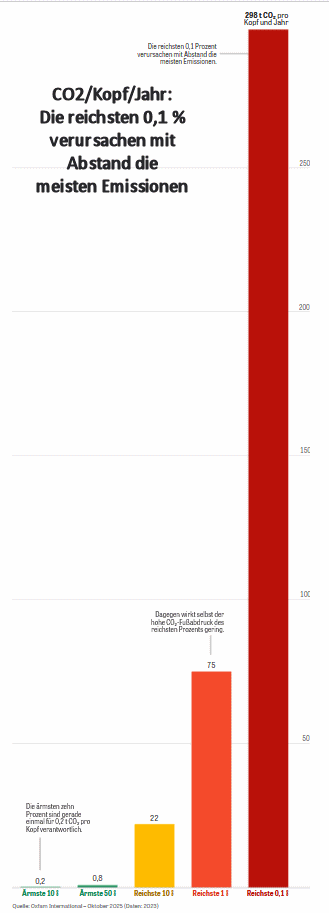 Auch in Deutschland zeigt sich die Klimakrise als Verteilungsfrage. Das einkommensstärkste Zehntel der Bevölkerung verursacht laut Oxfam rund 28 Prozent der deutschen CO2-Emissionen, fast genauso viel wie die gesamte ärmere Hälfte zusammen. Besonders extrem ist auch hier das oberste Promille. Eine Person aus den reichsten 0,1 Prozent stößt im Schnitt über 840 Kilogramm CO2 pro Tag aus - ein Wert, der keinen gerechten Beitrag zu den Klimazielen für Deutschland und Europa beisteuern kann. Die unteren 50 Prozent liegen dagegen bei etwa 16 Kilogramm, die ärmsten zehn Prozent sogar nur bei rund 11 Kilogramm CO2 pro Tag.