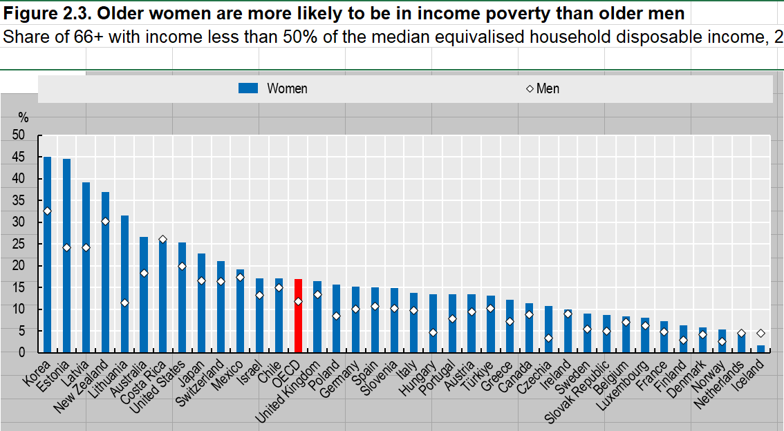 Blog 1475 27-11-25: Der Anteil älterer Frauen mit weniger als 50 % des Durchschnitts der Haushaltseinkommen ist mit 15 % relativ hoch