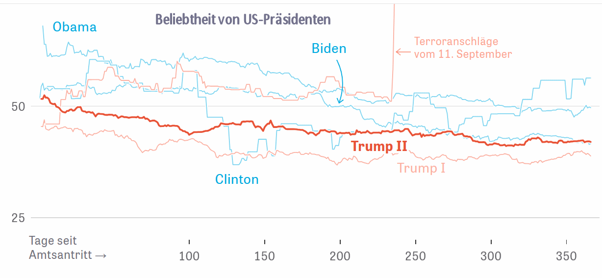 Trump war sowohl in seiner ersten, wie in seiner zweiten Amtszeit der unbeliebteste Präsident, den die USA je hatten (Abb. trump9.gif).